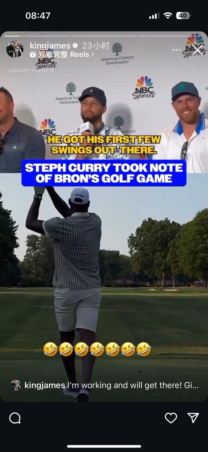 詹姆斯和库里近期在高尔夫球方面互动频繁,库里在球场模仿詹姆斯的挥杆动作,詹姆斯也在社媒转发库里采访:我在努力打磨高尔夫给我点时间。